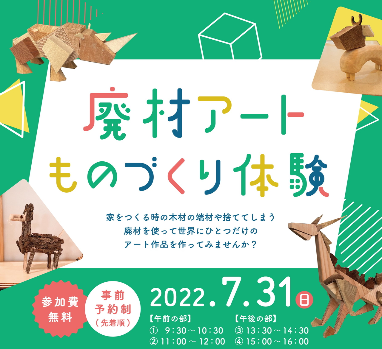 7月31日(日)に開催を予定しておりました「廃材アート ものづくり体験」を中止させていただきます。