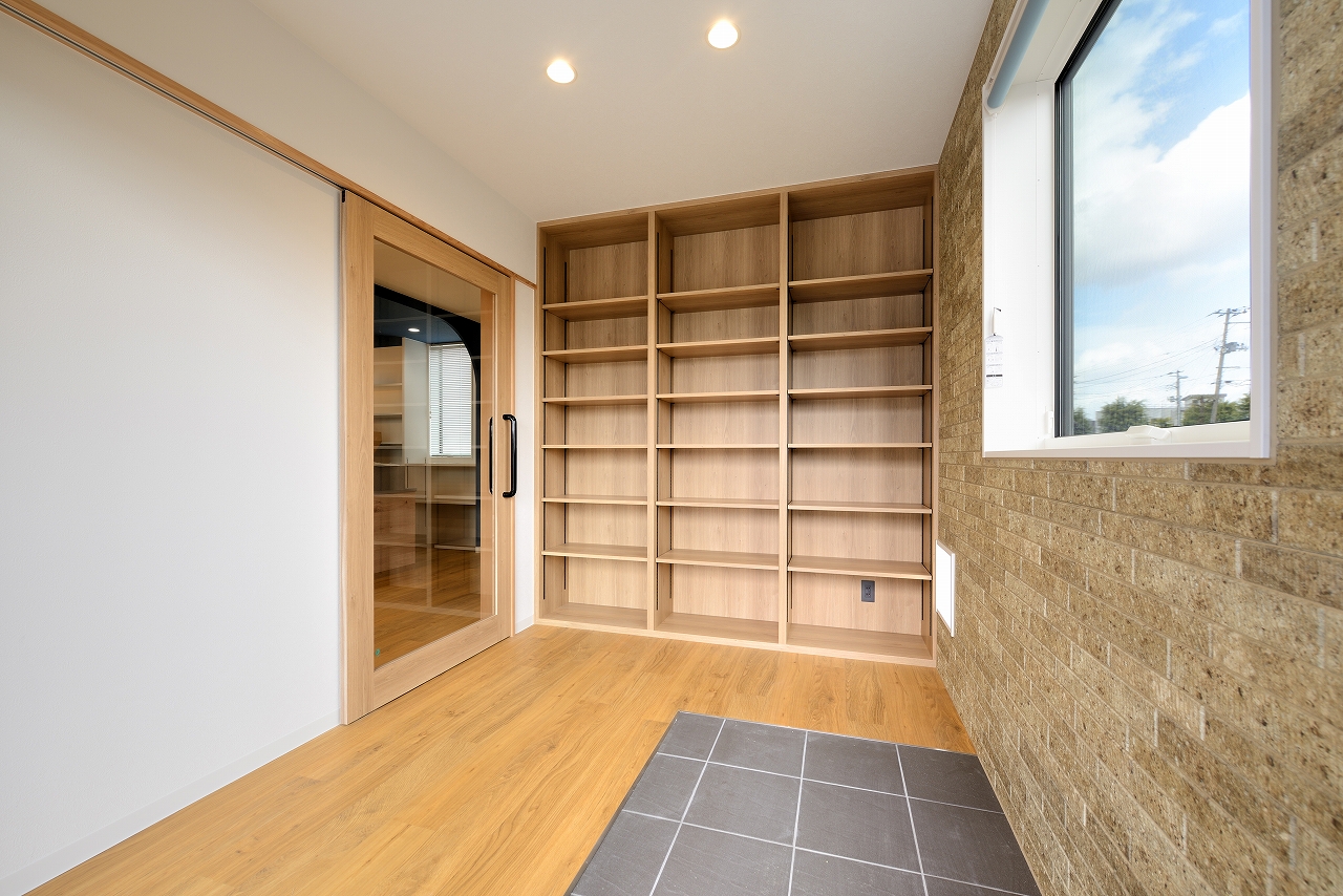 風除室内にも外壁材が入り込み外がつながっているような広がりを感じます。