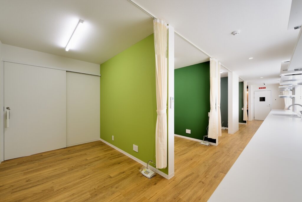 診察室はトーンの違うグリーンの壁をアクセントに。