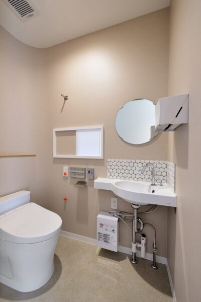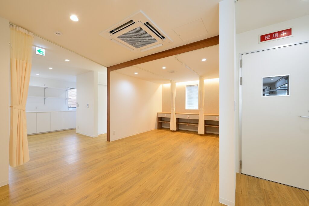 処置室は白ベースの空間の中に木のフレームで領域をつくっています。