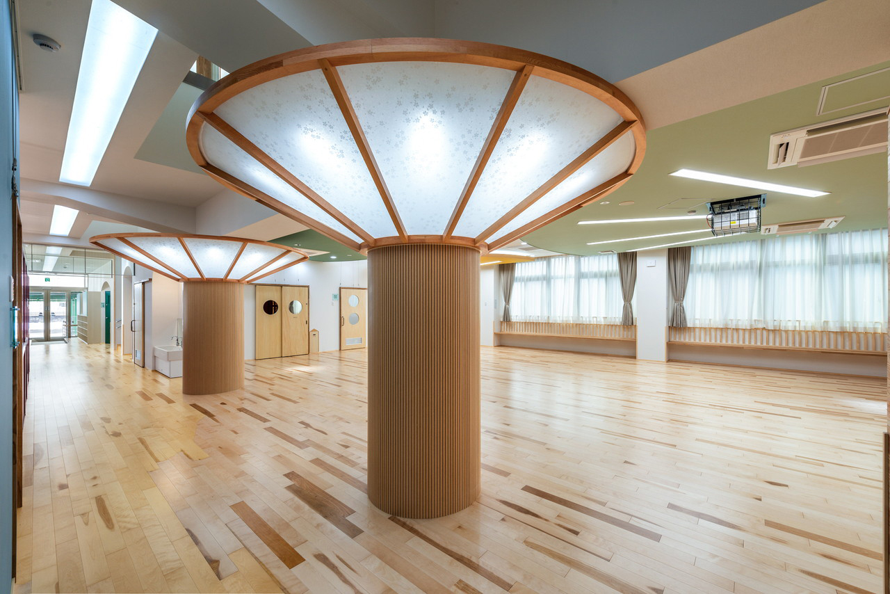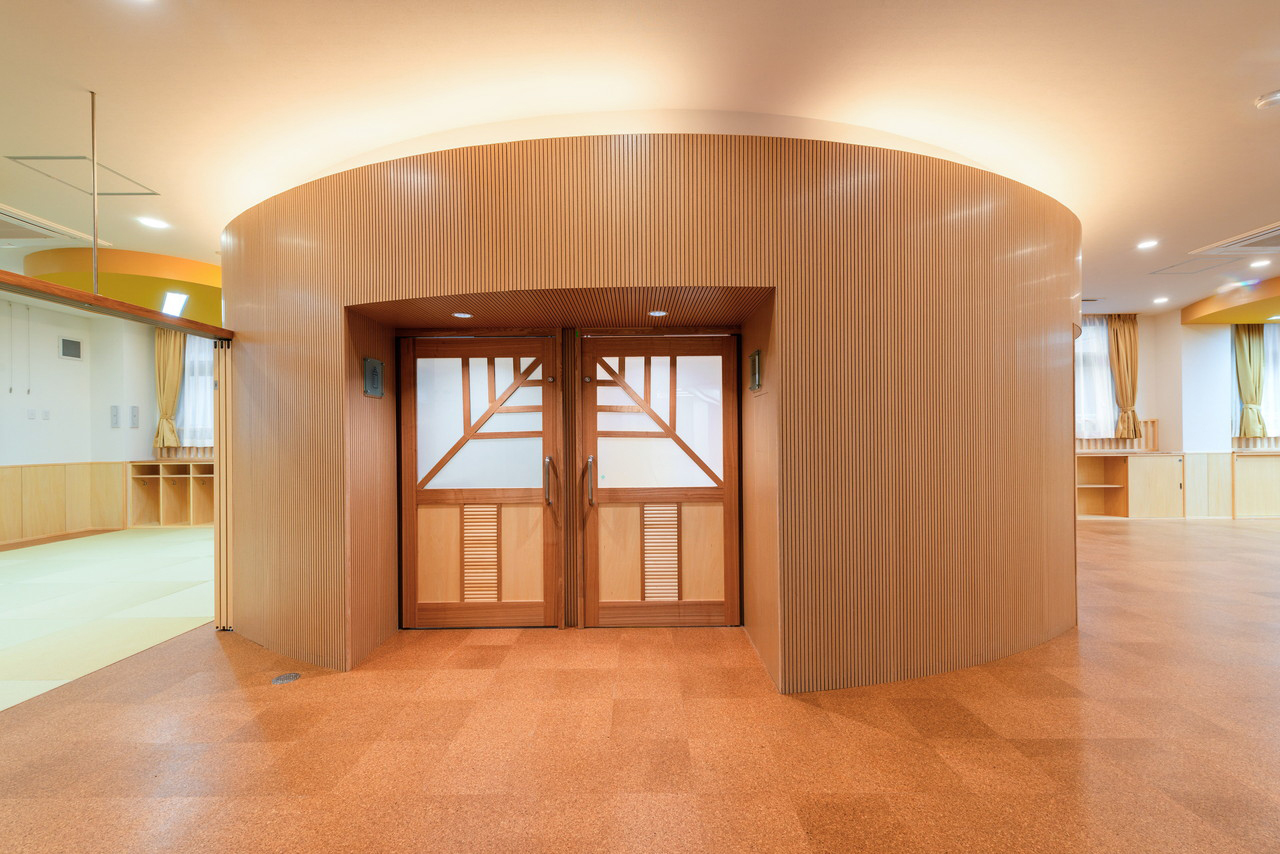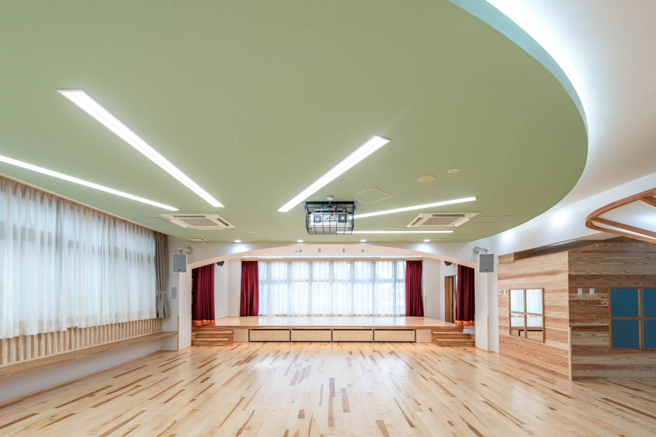 ③ コンクリ―トの構造は都市空間の中では要求されるが時に冷たさを演出することになりがちであるが、その内側の内装は木質のアーチを多用することで園児たちに優しい空間を演出する。
