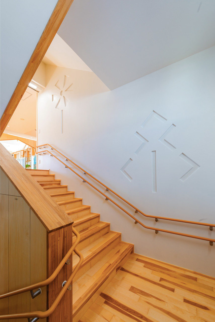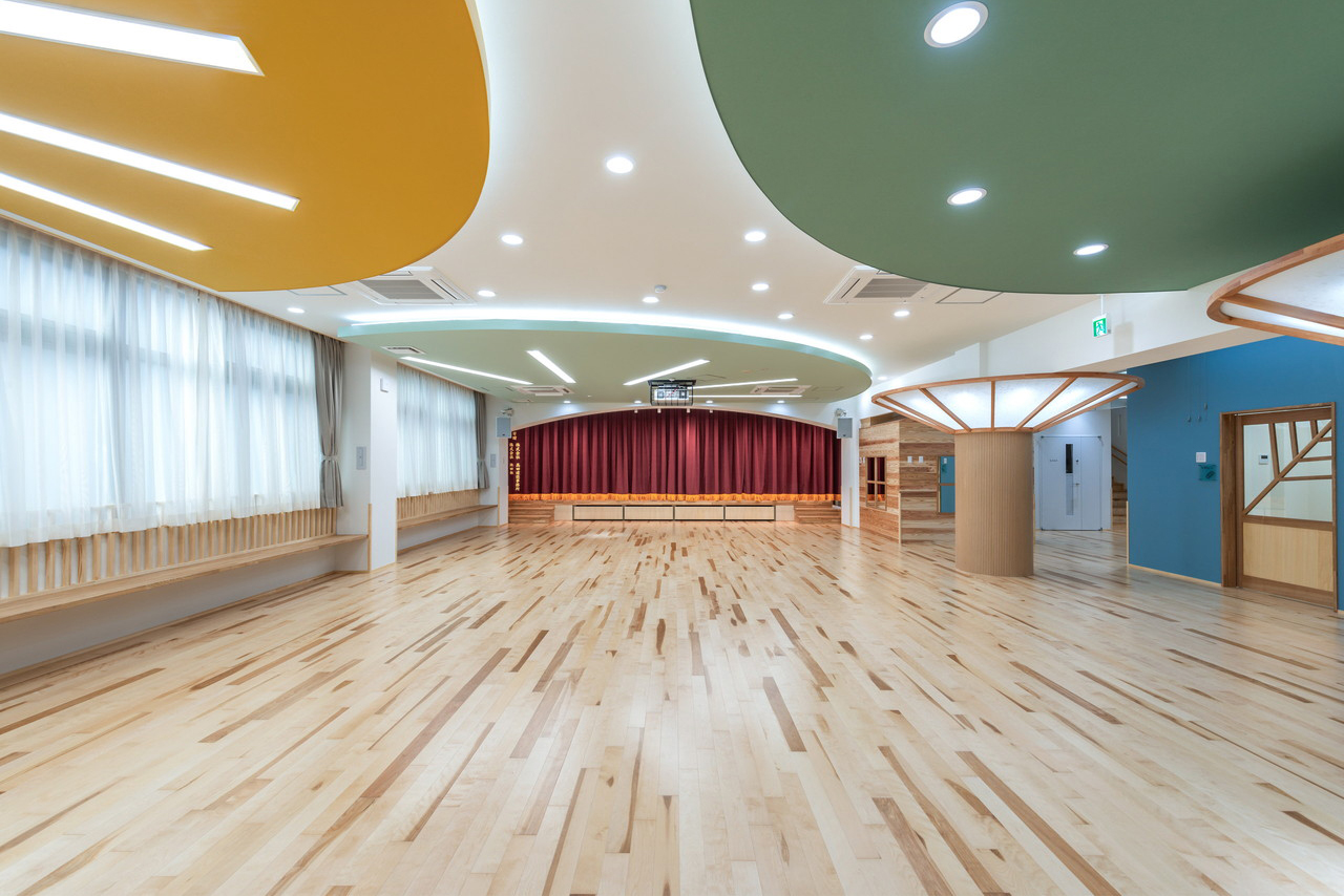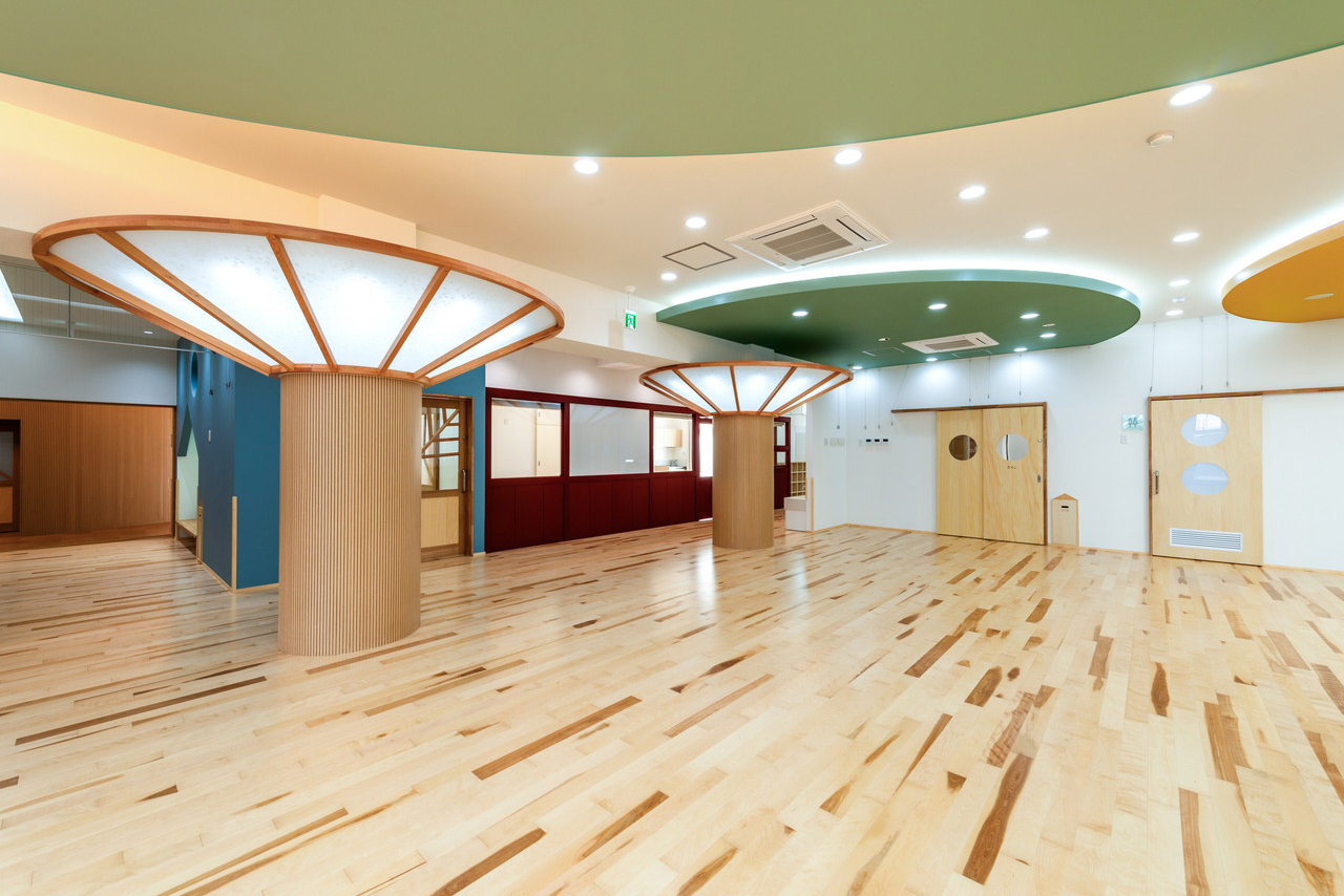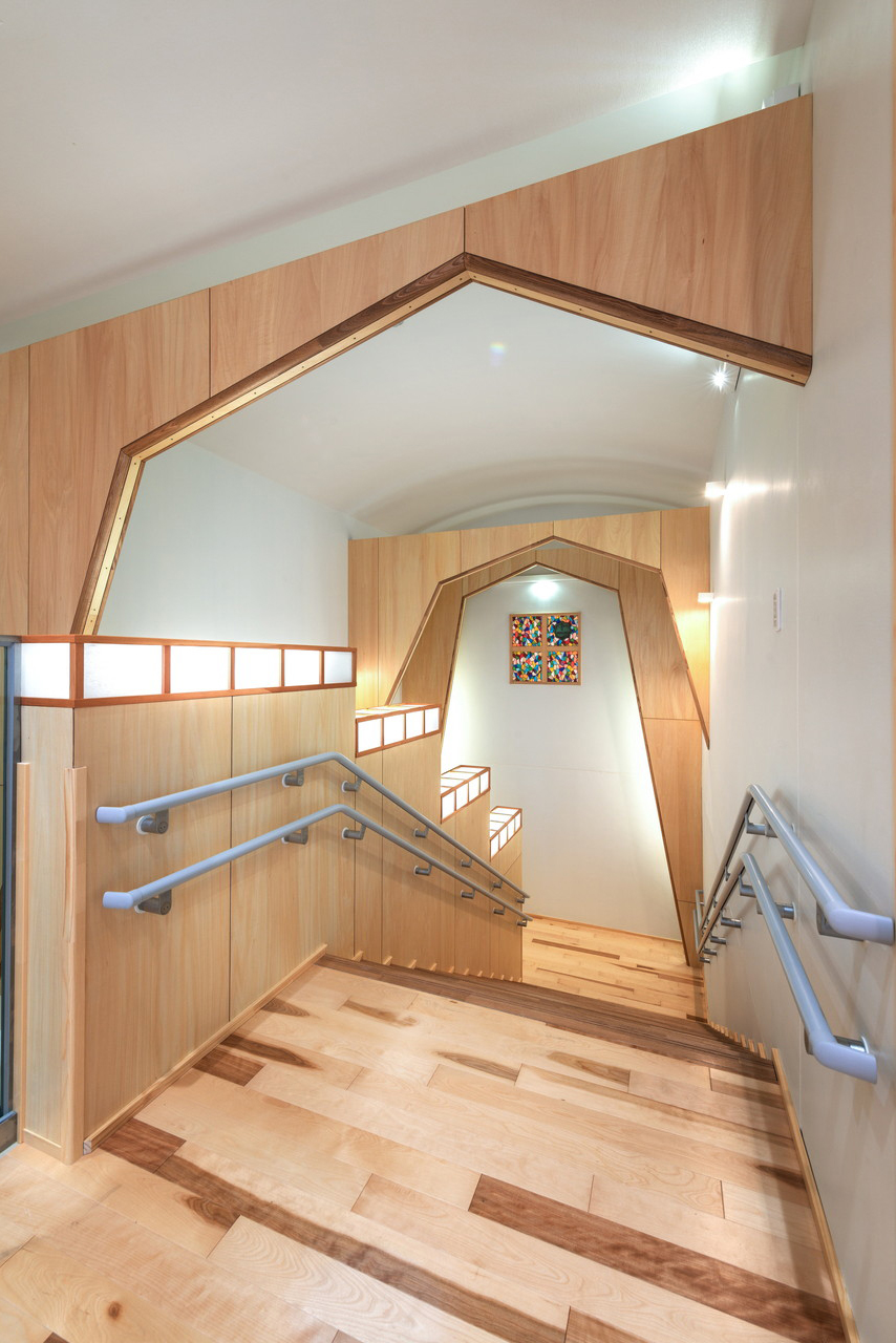 ③ コンクリ―トの構造は都市空間の中では要求されるが時に冷たさを演出することになりがちであるが、その内側の内装は木質のアーチを多用することで園児たちに優しい空間を演出する。