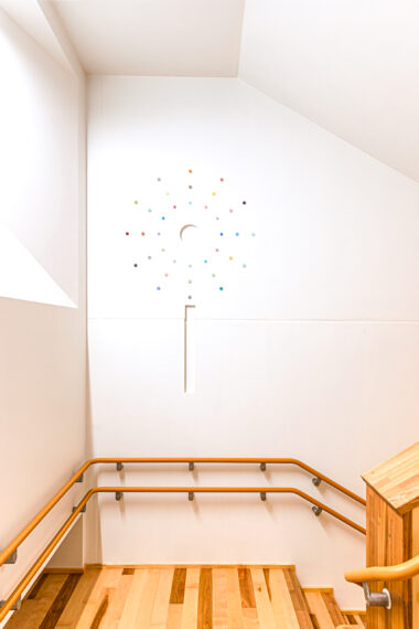 B階段:森や星座や花火がレリーフとして写し出されている
