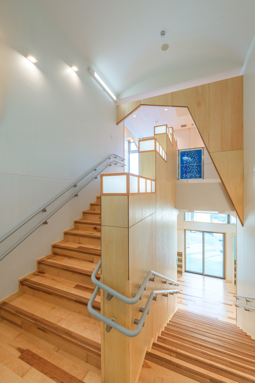 ② 大きな空間に様々にアレンジした小さなアルコーブ空間が入り込む。園児たちの居心地のよきたまり場となる。特に二つの階段は時に洞窟のような演出を試みた。