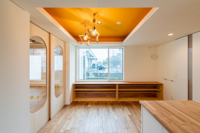 建物の外観では下屋部分に舟の幕板のイメージを重ね、低い軒が子供たちの身体スケールに寄り添うように存在しています。