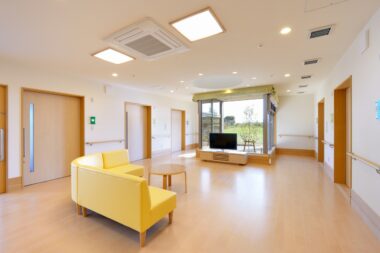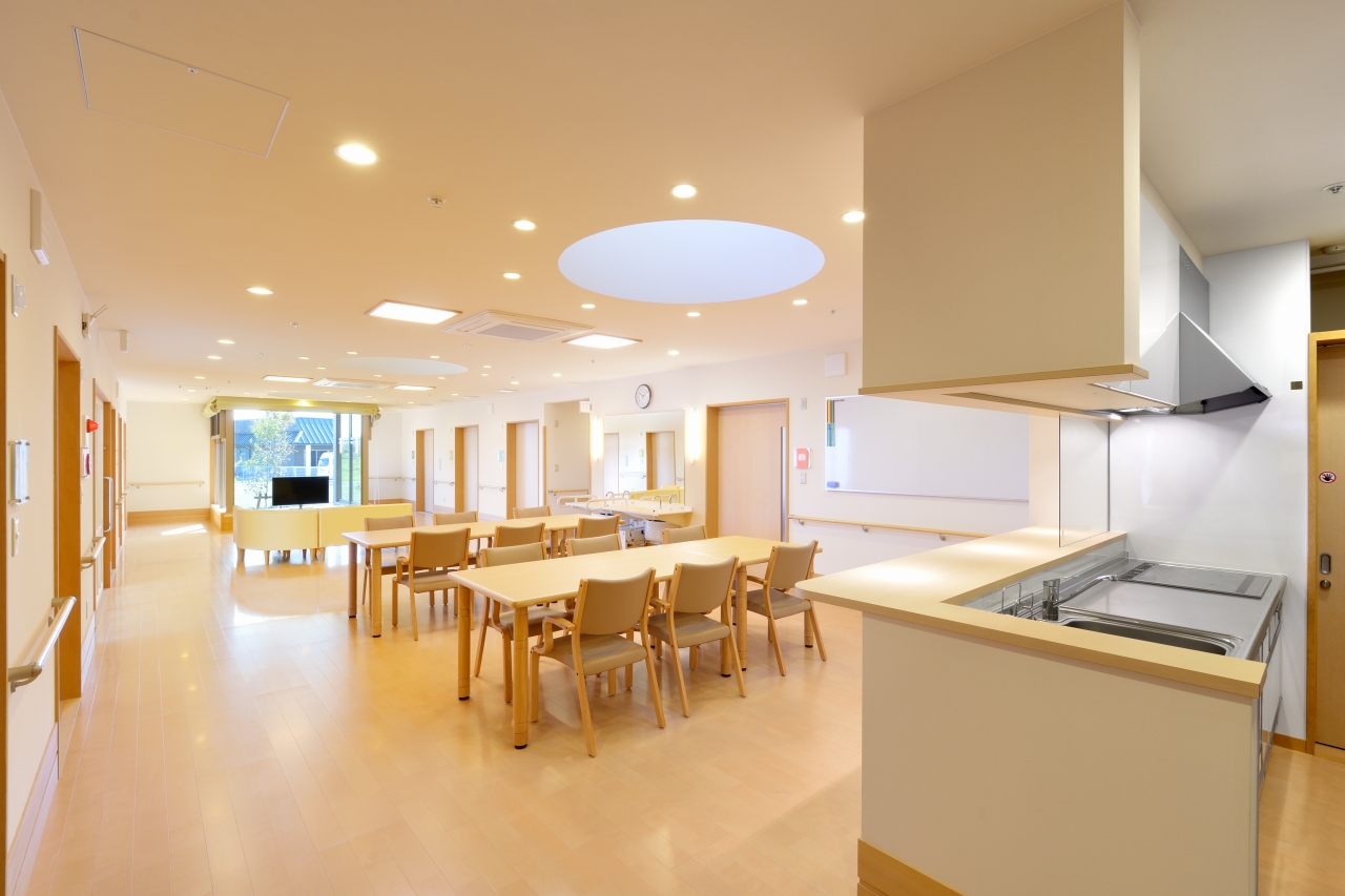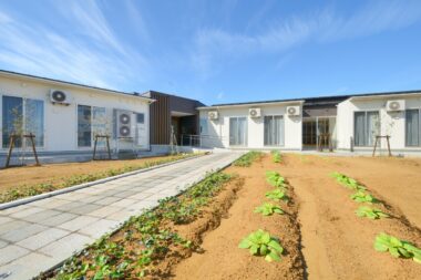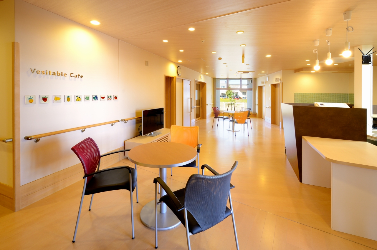 見附市の工業地域に認知症対応型の高齢者のためのグループホーム2ユニット、小規模多機能事務所からなる複合介護施設「Care garden新幸」が完成しました。 敷地内には畑を計画しており、利用者様が育つ野菜を身近に感じたり、また小規模の通いの方や地域の方と一緒に作業することで交流が広がるなど、畑を通じて豊かに暮らすことを提案しています。 正面の玄関ホールにはキッチンがあり、時には収穫した野菜を分かち合うベジタブルカフェとして機能するなど、室内で野菜を身近に感じる空間が散りばめられています。