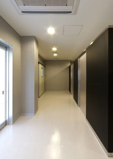 建物としては、正面にある外部階段が建物と馴染むよう、黒いゲートでつないで一体化するデザインを強調しています。また歩道沿いにある事務室の壁面形状を特徴的にすることで、工場建築の無機質さを押さえ、前面道路からの表情に変化をつけています。シルバーを基調とし、ポイントで黒を入れたシンプルかつ洗練されたデザインとすることで、最新の技術が蓄積されている場所にふさわしい外観となるよう設計しました。