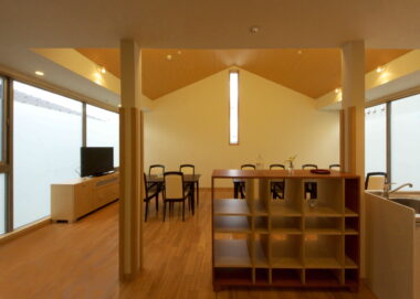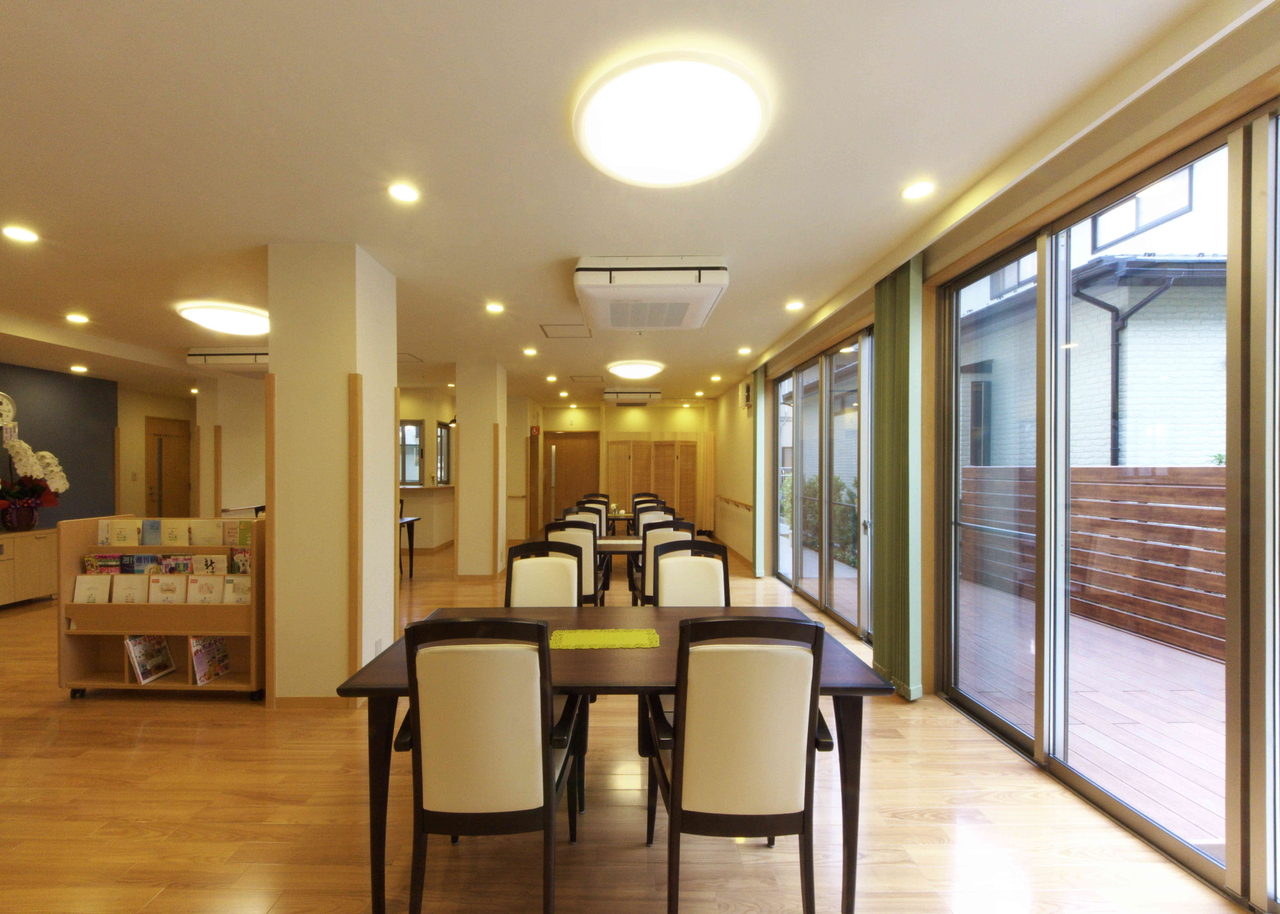 建物の中は、サービス付高齢者住宅とデイサービス、2つの食堂を隣接したプランとし、かつ大きな窓で外部を取り込むことで、広がりのある空間としました。利用者の方々が自然と集うような居場所となるよう設計しています。