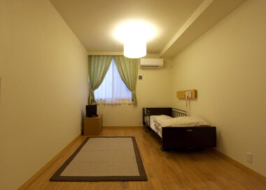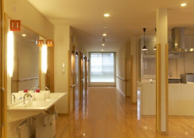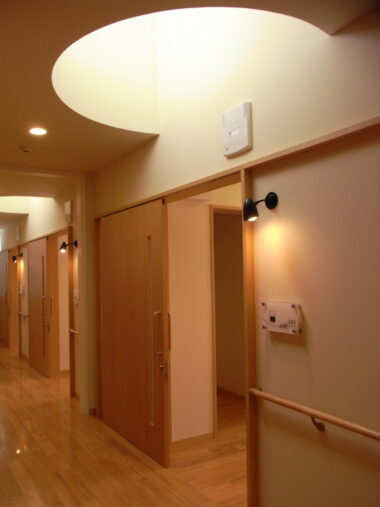 また、利用者の居室が並ぶ真っ直ぐな廊下は単調にならないよう、表情をつけました。天井は所々に円形の吹き抜けをちりばめることで、外部からの光が柔らかく落ちてきます。各部屋の入口にはブラケット照明と部屋番号を入れたインターホンプレートを付けて、街路のような雰囲気を演出しています。