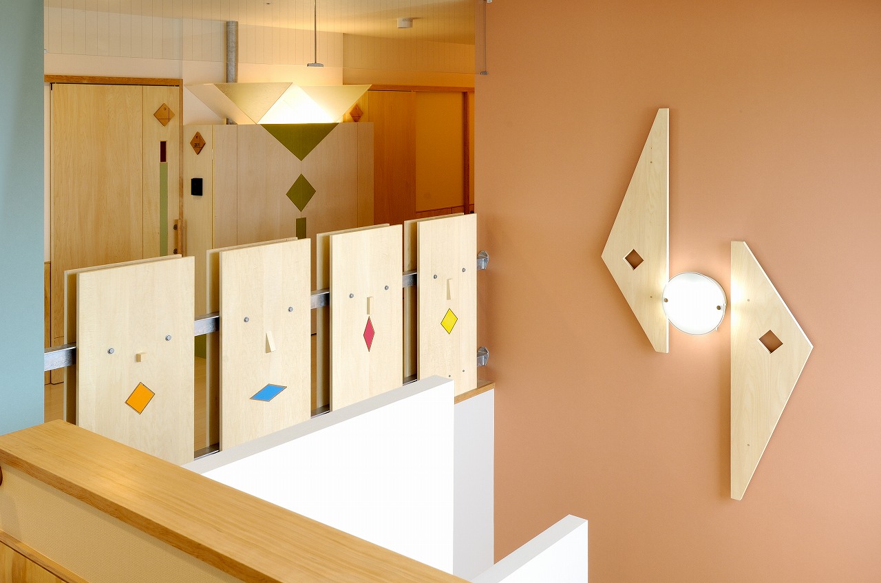 2階への階段室の手摺にはダイヤモンド合唱団。口から毀れる声は宝の言葉!