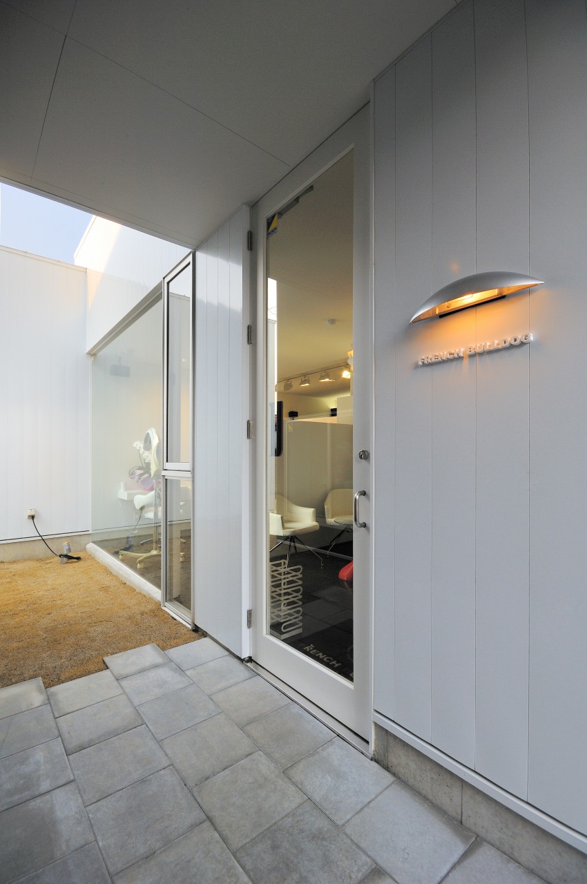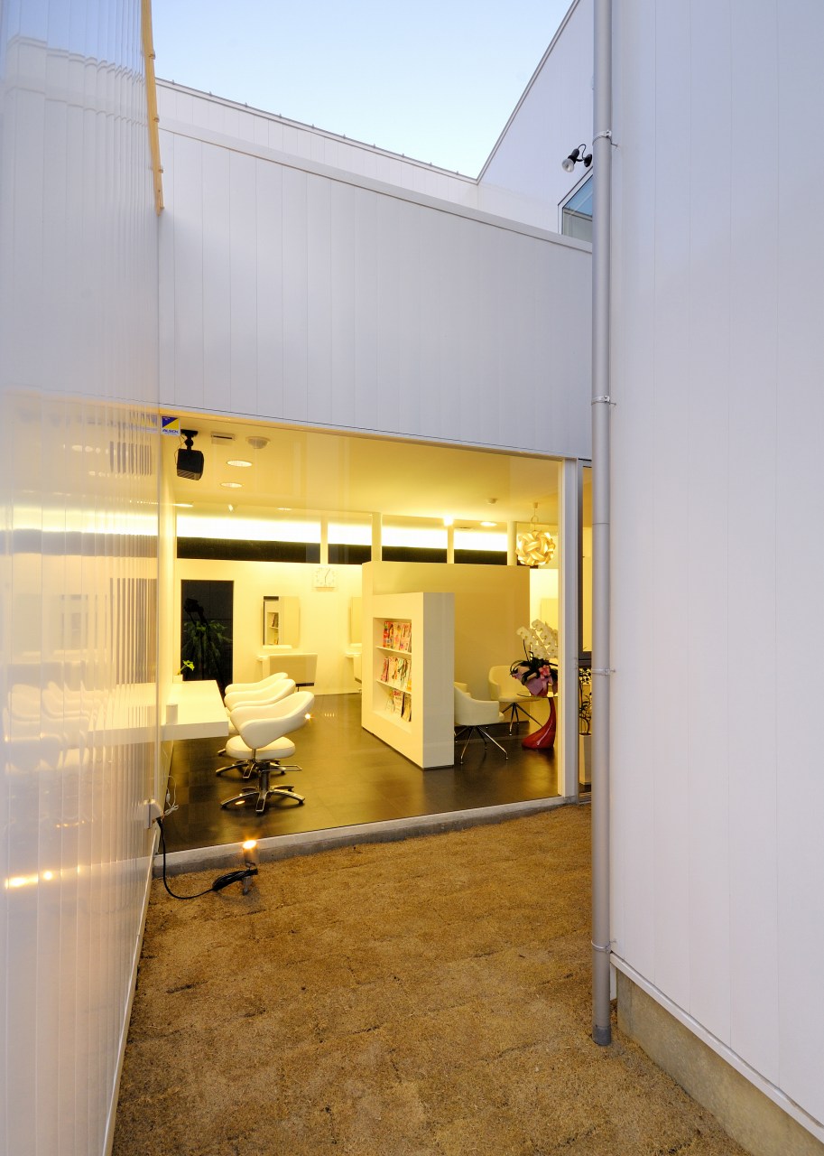 1階が店舗、2階がオーナー様のご自宅の店舗併用住宅です。 日差しの影響を考慮して、正面の窓を極力少なくしました。 中をうかがうことができず、無機質のように感じますが アルコーブ型のエントランスと中庭へ引き込まれると 中庭が緩衝帯(かんしょうたい)となって 店内には穏やかな時間が流れます
