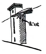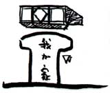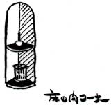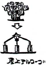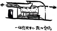■道である廊下にはいくつかのアルコーブが用意されている。一つは、「独楽の間」である。ここには4本の柱が三角形配置されておりそれらをつないでいるロープ網は雲をデフォルメ。別に、「案山子のコーナー」がある。この上には小さなトップライトが2個用意されている。