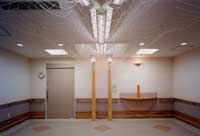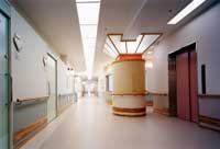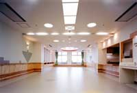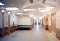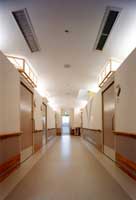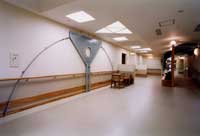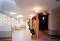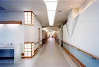 ■左右に伸びる大廊下は町で言えば「道」にあたる。当ケアーハウスは、26人の人達で構成される小さな町である。プライバシーを守られながらもパブリック空間も大切にされなければならない。