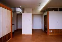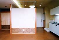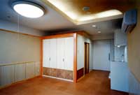 i/キッチンコーナー、ベッドルームコーナー、居間コーナーは、家にいる気分にする操作として、様々な材質を用いた。例えば、クロスに腰板張り。珪藻土は京壁の並びに置き。床材は、コルクの温かさを採用。