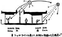 ■北側に面する部屋の人達に南面の光が入る様にトップライトを夫々に用意してあります。調光ブラインドを使用すれば部屋の光を楽しむ事が出来ます。