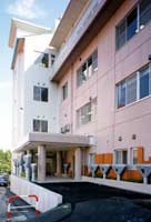 老健施設“桃李園”の入り口と並んで、ケアーハウスのエントランスがとられております。既存建物の壁面に板張りを施し施設と言うより住宅へのアプローチ感覚を取り戻そうと致しました。