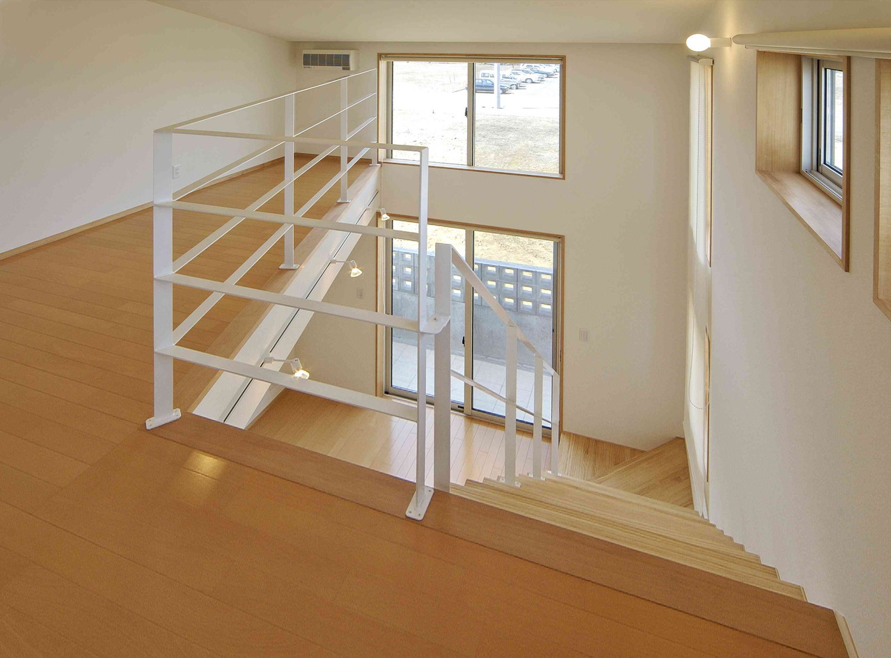 吹抜の中にかけられたホワイトステップはギャラリー空間と楽しく語らいます。