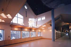 丸柱と丸キャピタルで構成されたフラットスラブ工法をそのまま樹々にたとえて内装表現した。