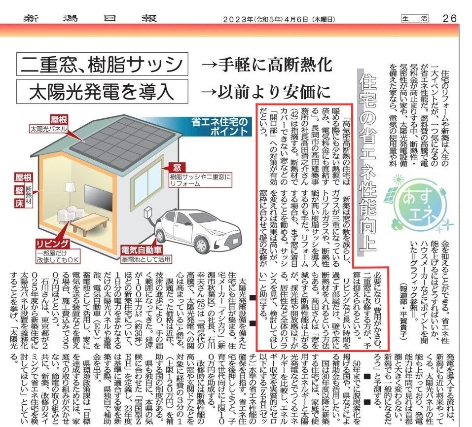 4月6日付けの新潟日報朝刊の26面「住宅の省エネ性能向上」に 弊社社長 高田清之介の取材コメントが掲載されました。