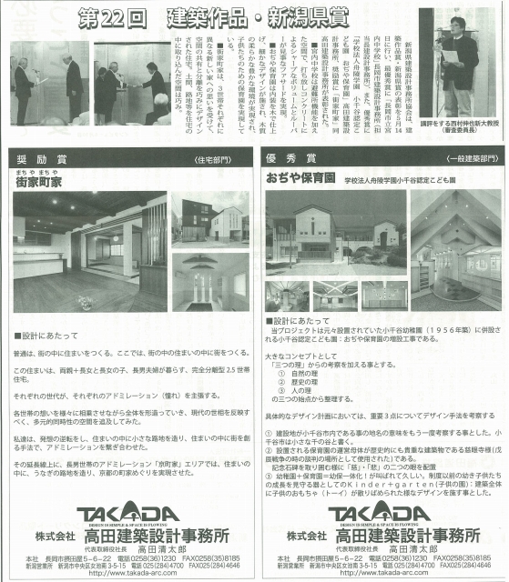 6月30日発行の建設ジャーナルに第22回建築作品新潟県賞で優秀賞を受賞した「おぢや保育園」と 奨励賞を受賞した「街家町家」が掲載されました。