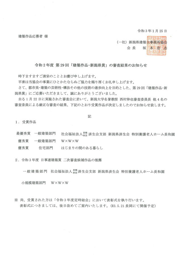 新潟県建築士事務所協会主催の 令和2年度 第29回「建築作品・新潟県賞」にて、