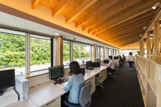 2F(執務スペース)は、宇宙船のキャビンをイメージして、緑の中にフロアーを浮かせる。