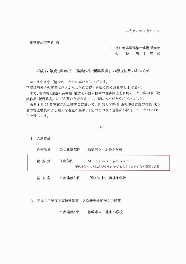 新潟県建築士事務所協会主催の 平成27年度 第24回「建築作品・新潟県賞」にて、