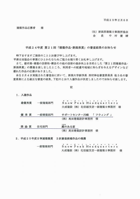 「第21回建築作品・新潟県賞」にて優秀賞・奨励賞を受賞しました。