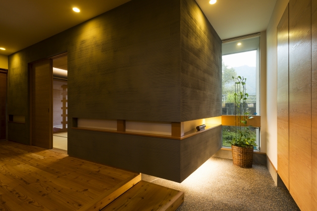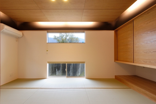 4.『内』床・天井に貼られた無垢材は安らぎを与えてくれます。また、落ち着いた重みのあるえんじ色の塗り壁は、そこをくり抜くことで風景を一枚の絵画のように切り取る額縁のようです。