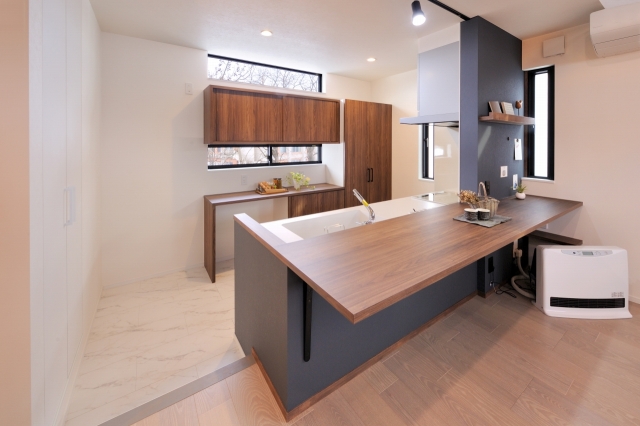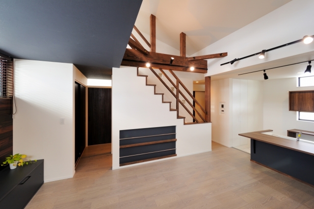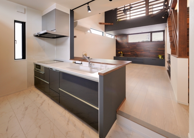 家で過ごすひと時を もっと特別なものに・・・ 一段掘り下げたピットキッチン スタイリッシュなカウンターダイニング 片貝花火も眺められるスカイロフト モノトーンでまとめた大人空間