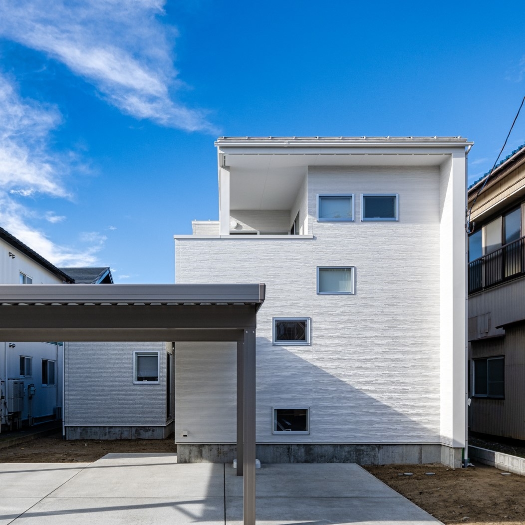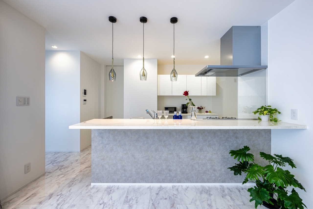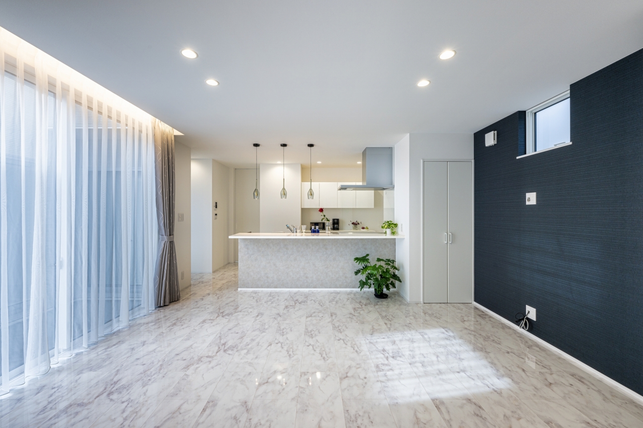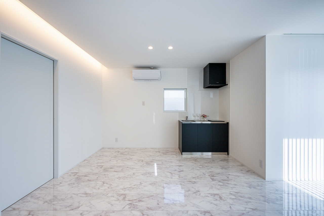シンプルな内装にマットブラックのスタイリッシュキッチンが映える。