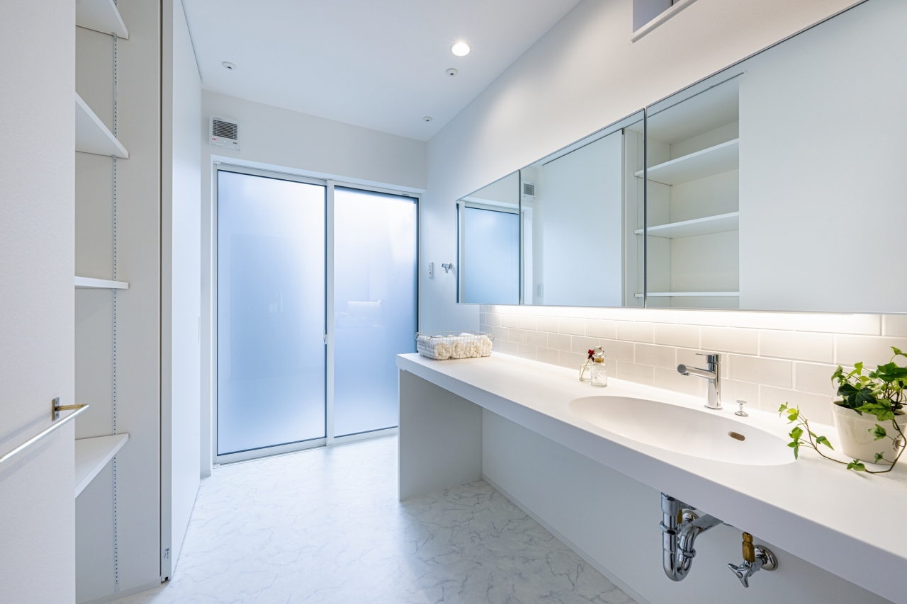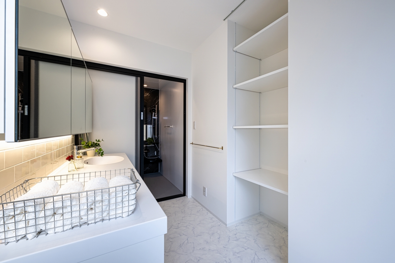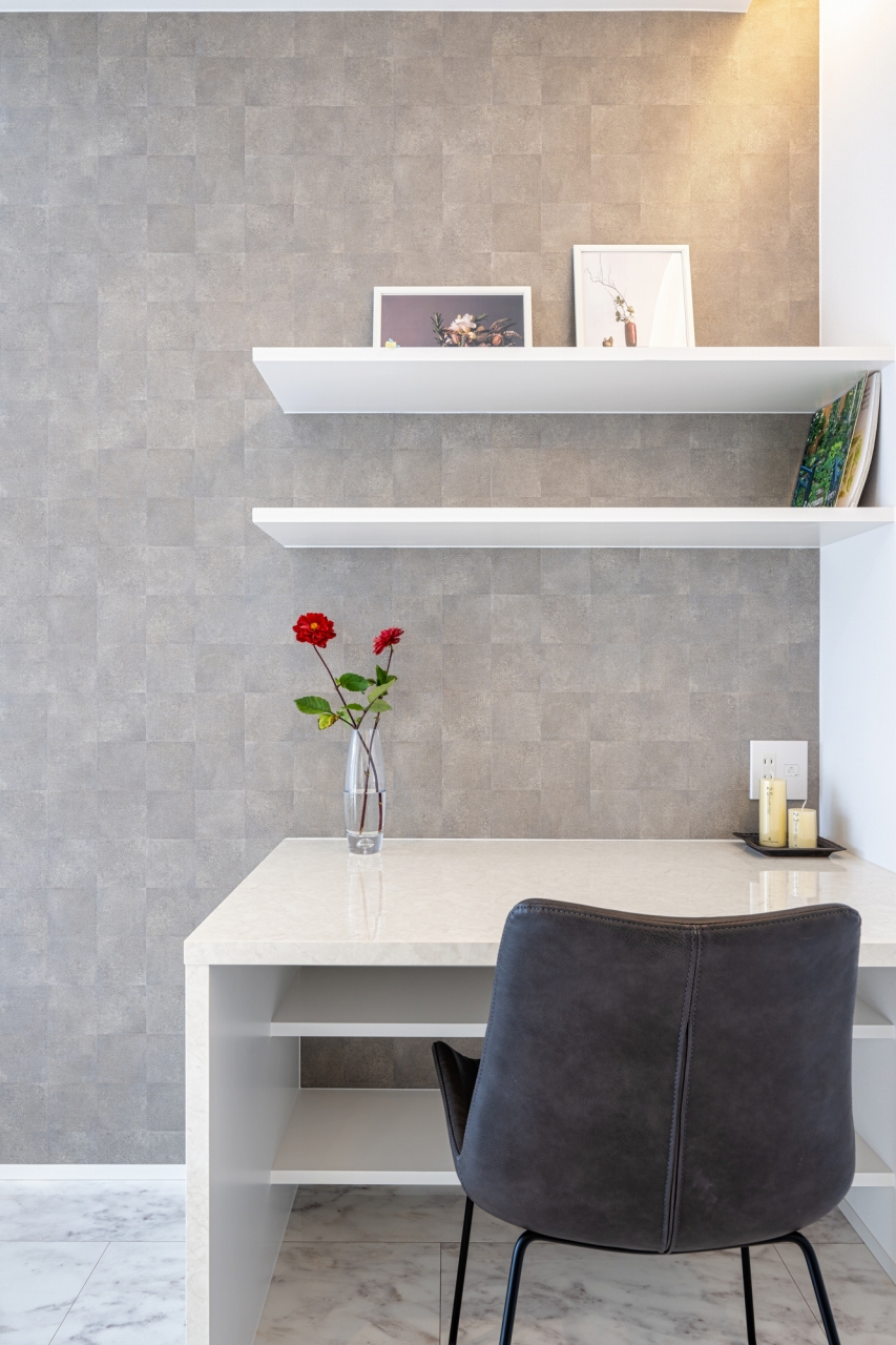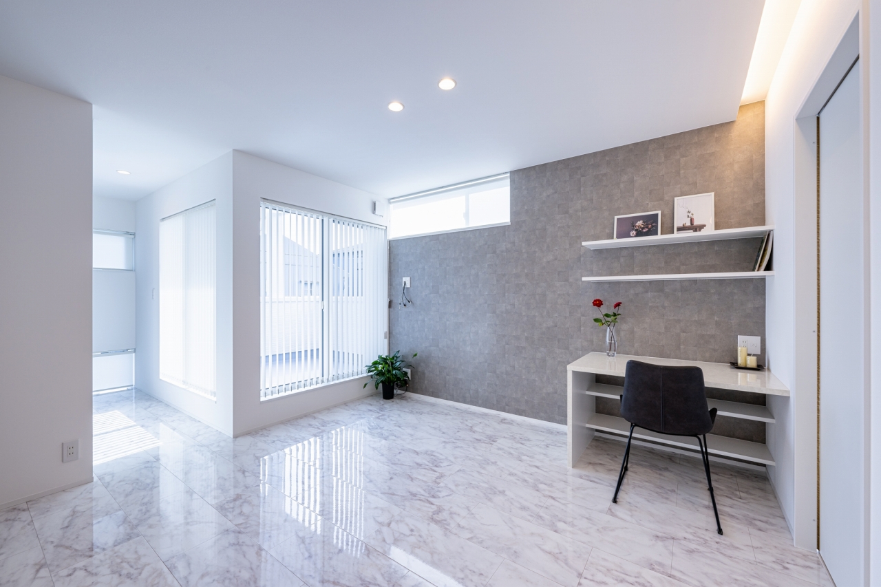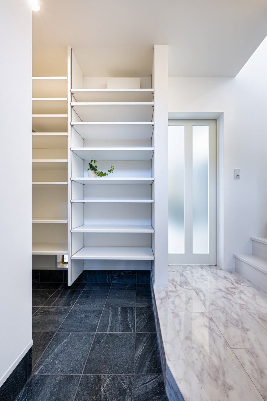 ストーン調の鏡面素材で仕上げた玄関ホール。