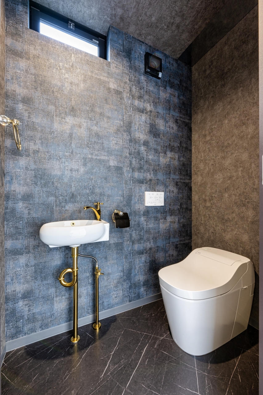 対照的なダーク系でまとめたWC。 真鍮のアクセサリーがワンポイント。