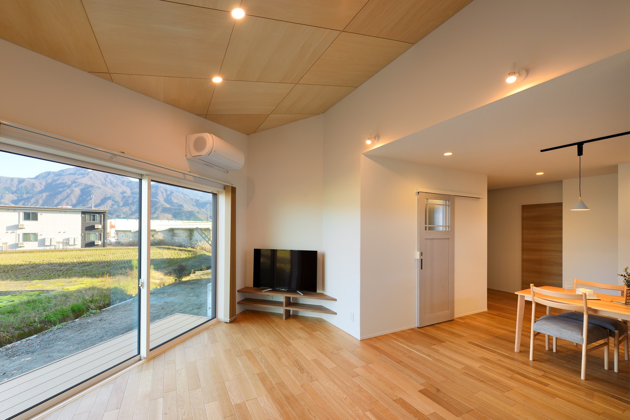 斜めを基調としたリビングからは季節を感じるカキの木
