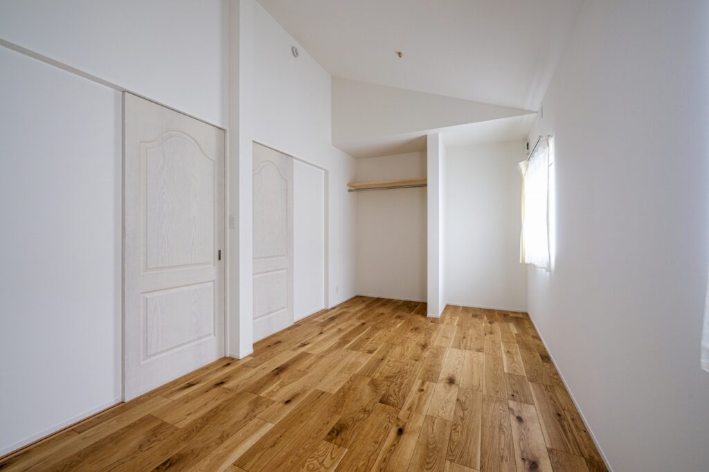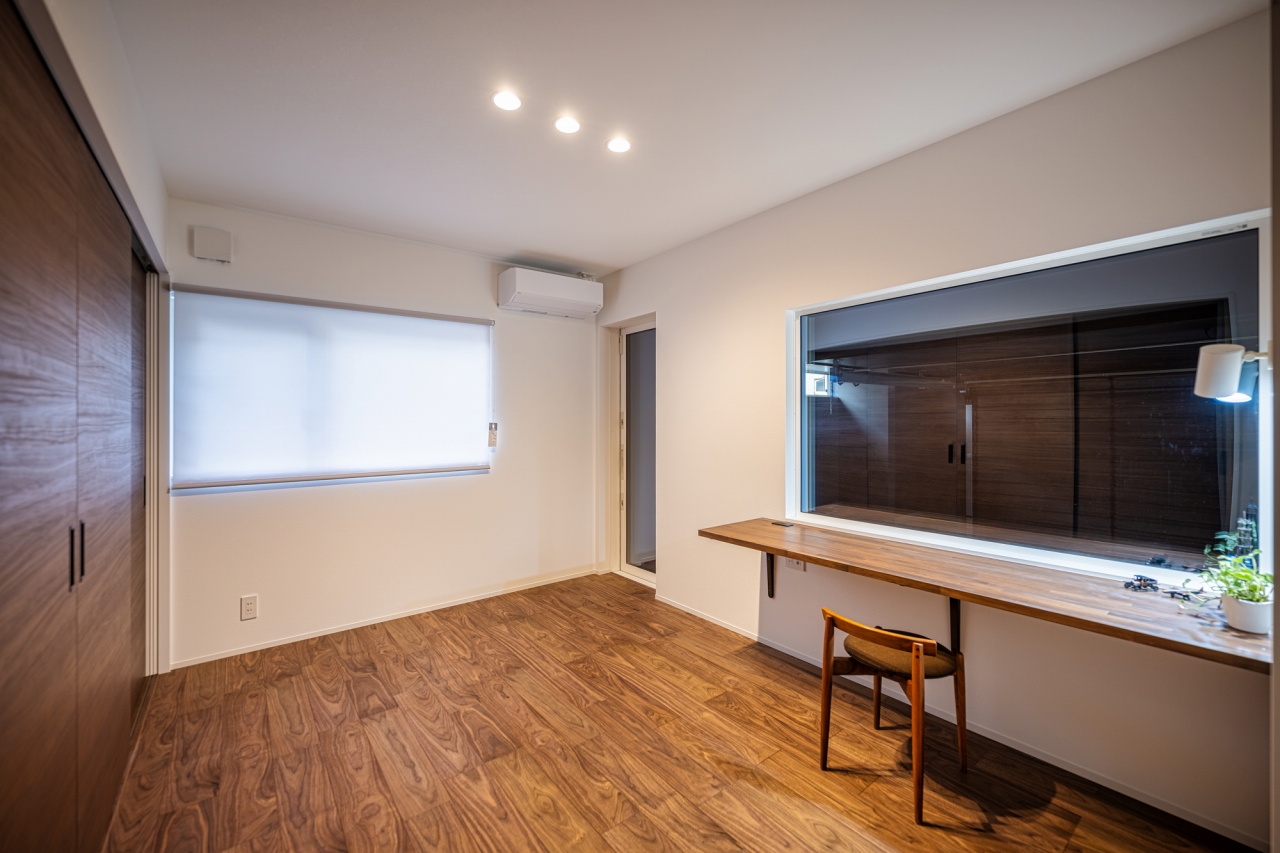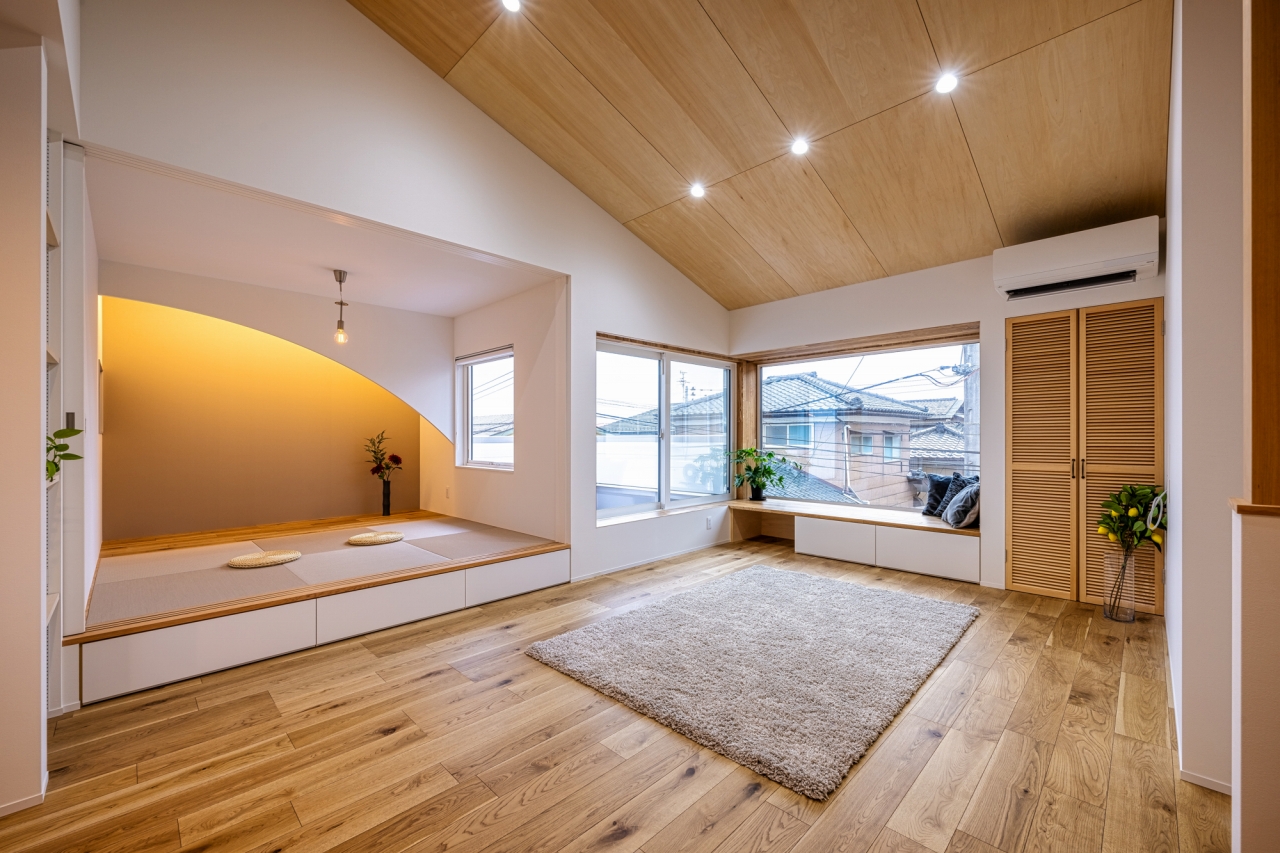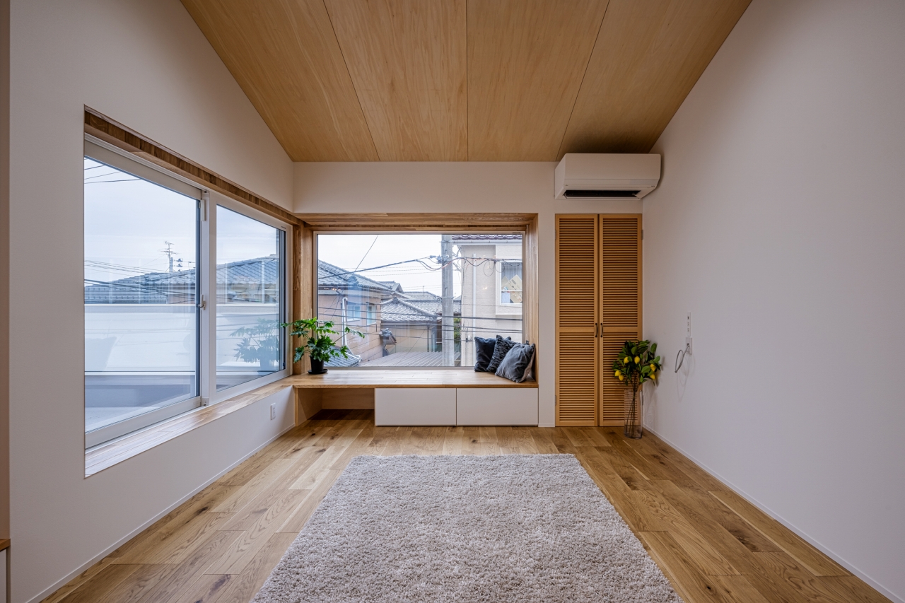 シナ合板の勾配天井とオーク材の出窓で木のぬくもりに包まれた空間に。
