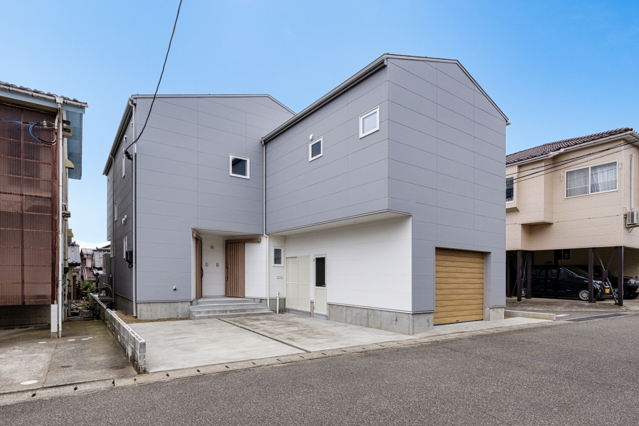 グレーのサイディングでマットに仕上げた外観。