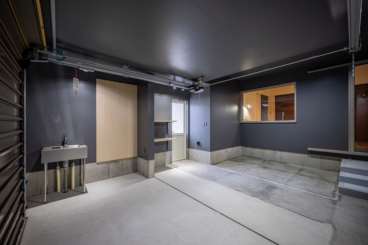 照明やシンクなどこだわりのインナーガレージ。有孔ボードや棚で収納もスッキリと。