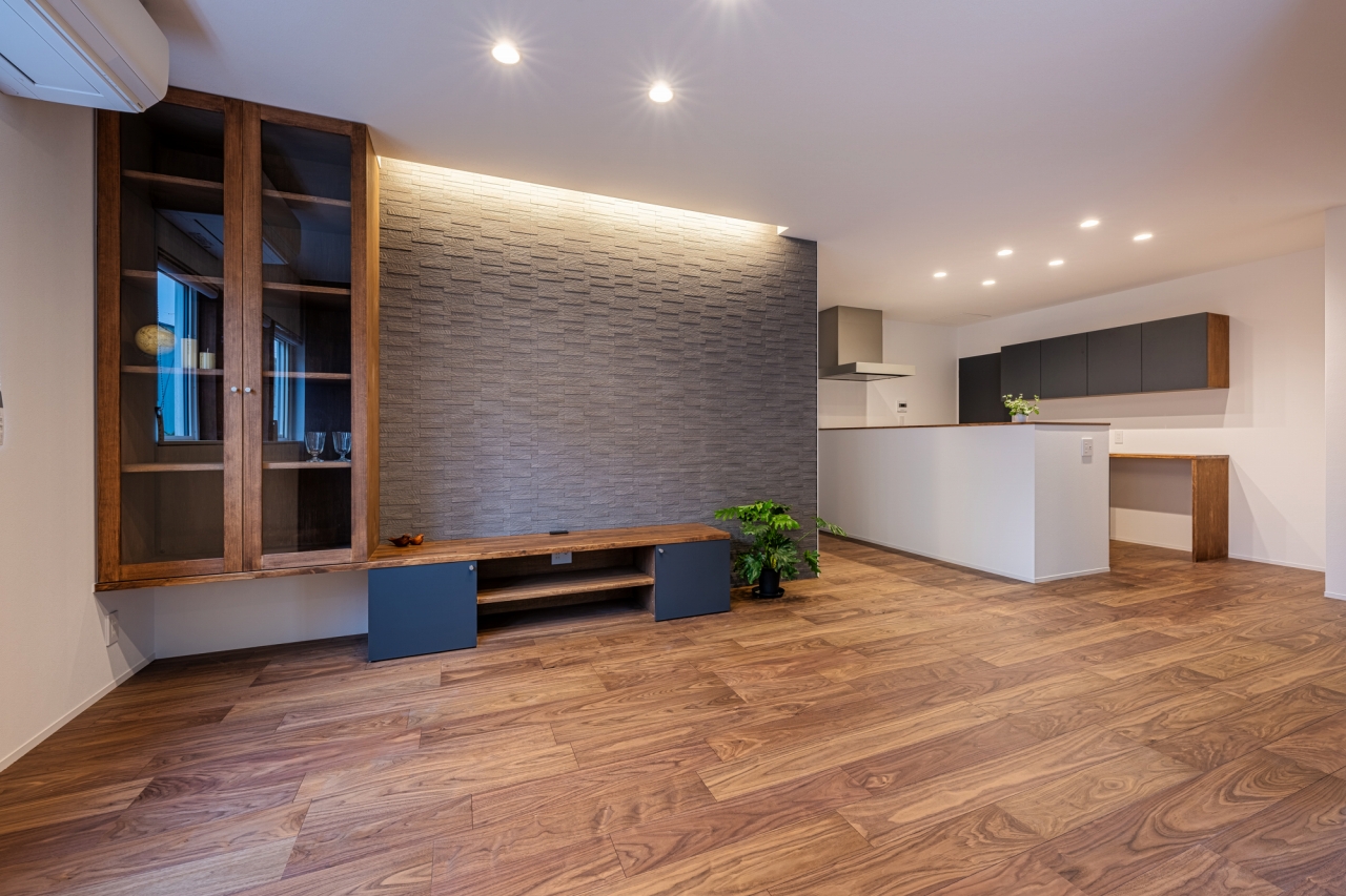 アクセントウォールが目を惹く空間。格子の内窓からはタタミスペースがちらり。