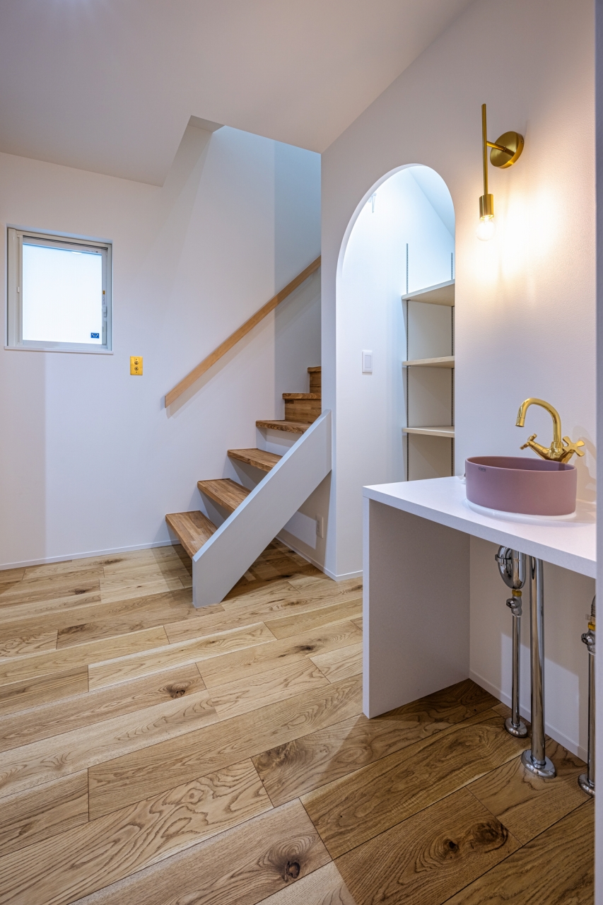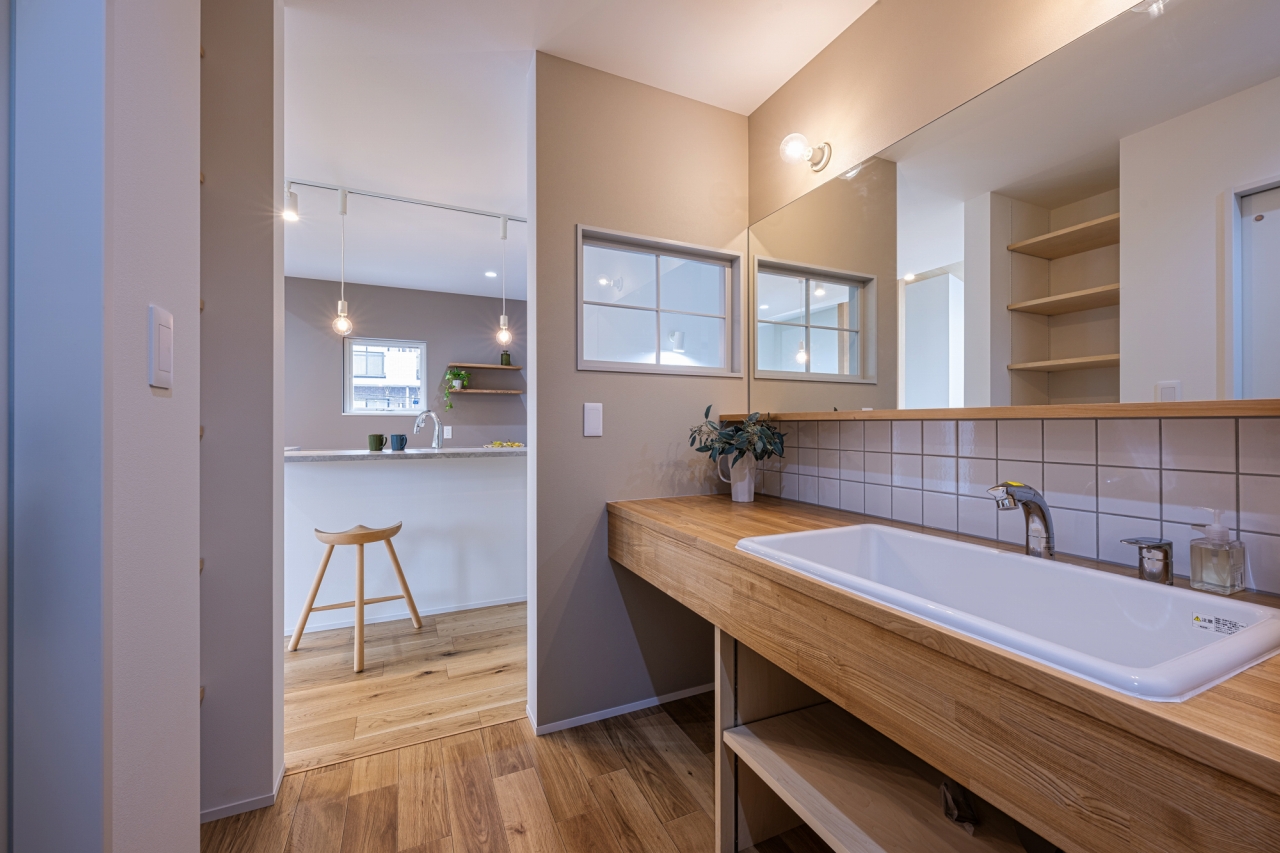 広い洗面室はLDKと内窓でゆるやかにつながる。