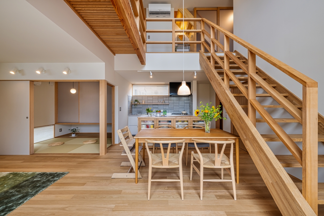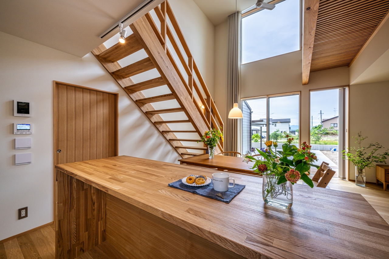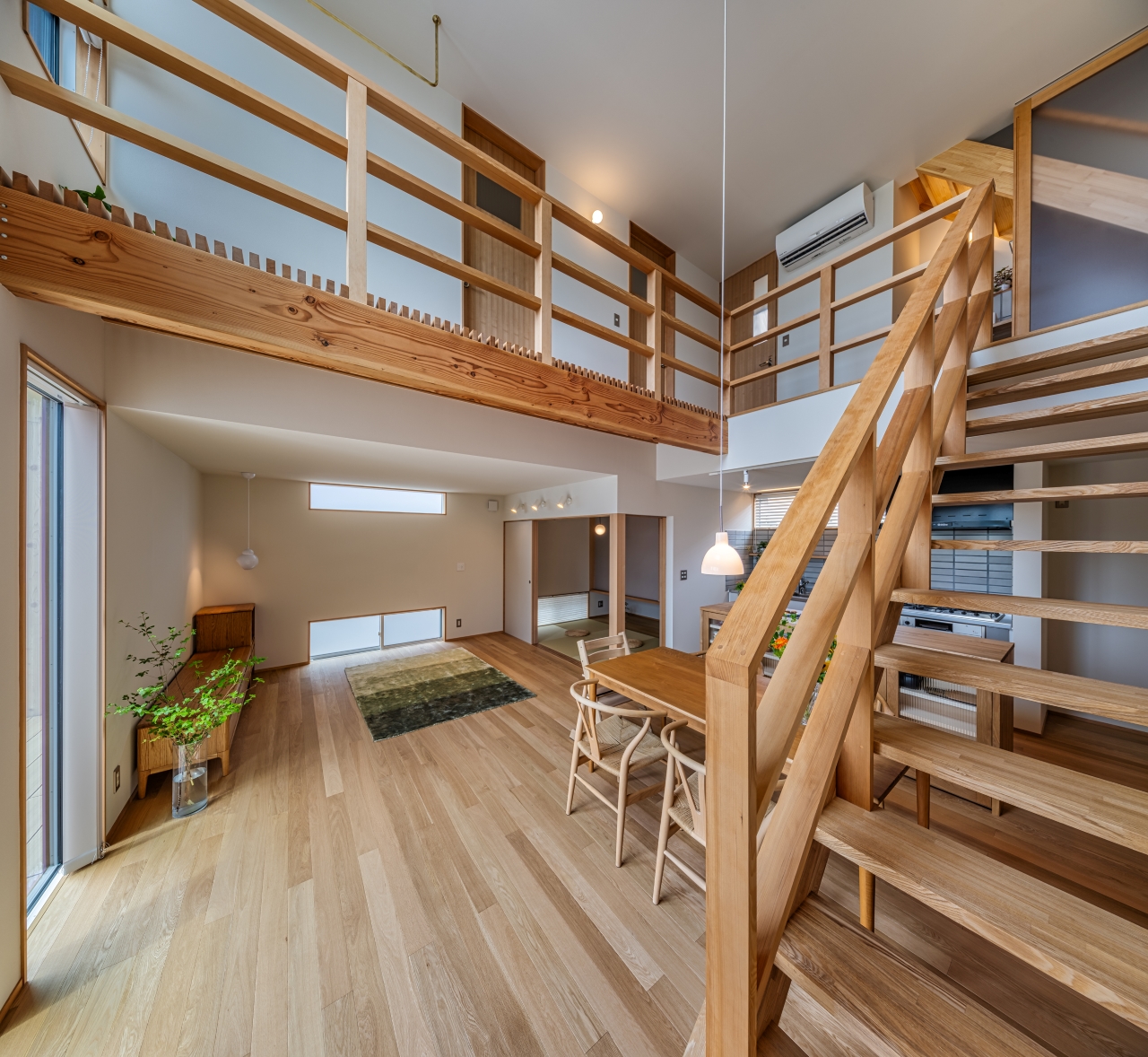 2200mmに抑えた平天井と吹き抜けの対比で、より解放感のある空間を演出。