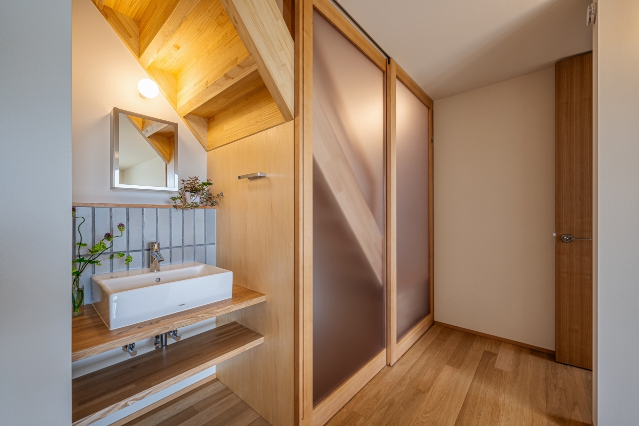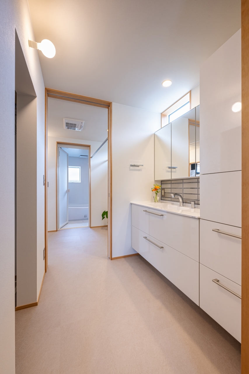 玄関から一直線に洗面から風呂まで繋がる、シンプルな水廻り動線