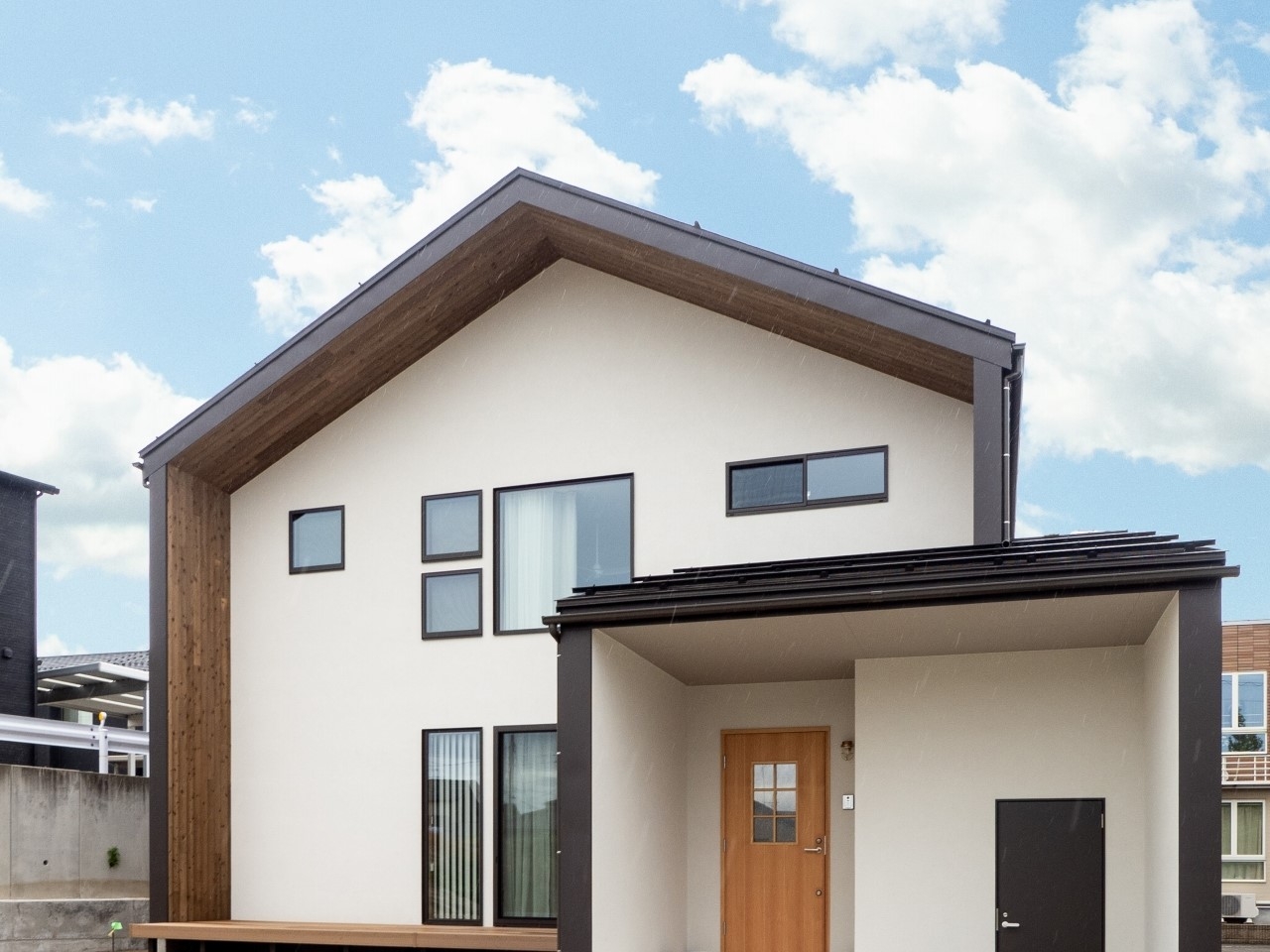 こげ茶のガルバリウムをメインに、塗壁と木でぬくもりのある外観。