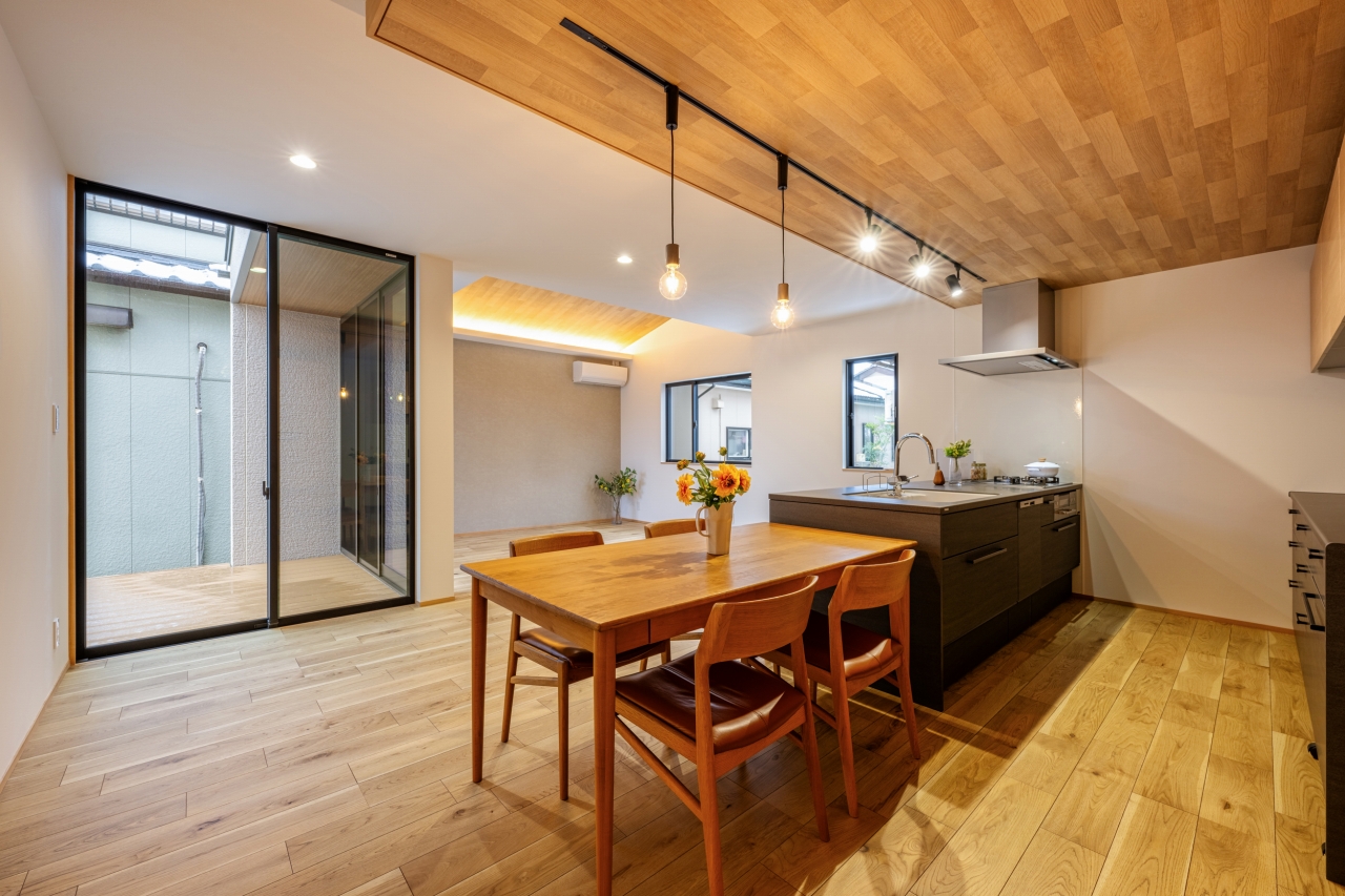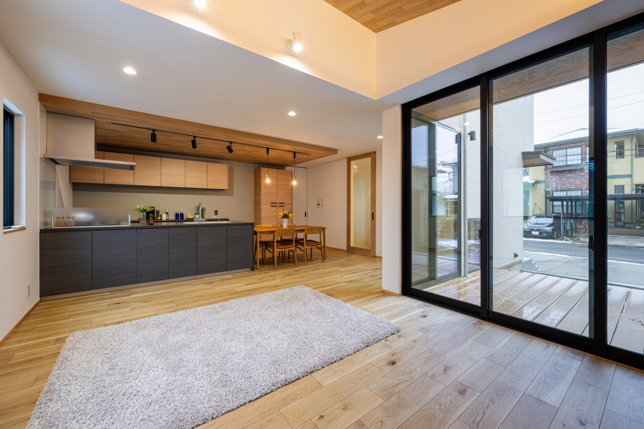 ウッドデッキを取り込み、視線の広がりを感じられるLDK。