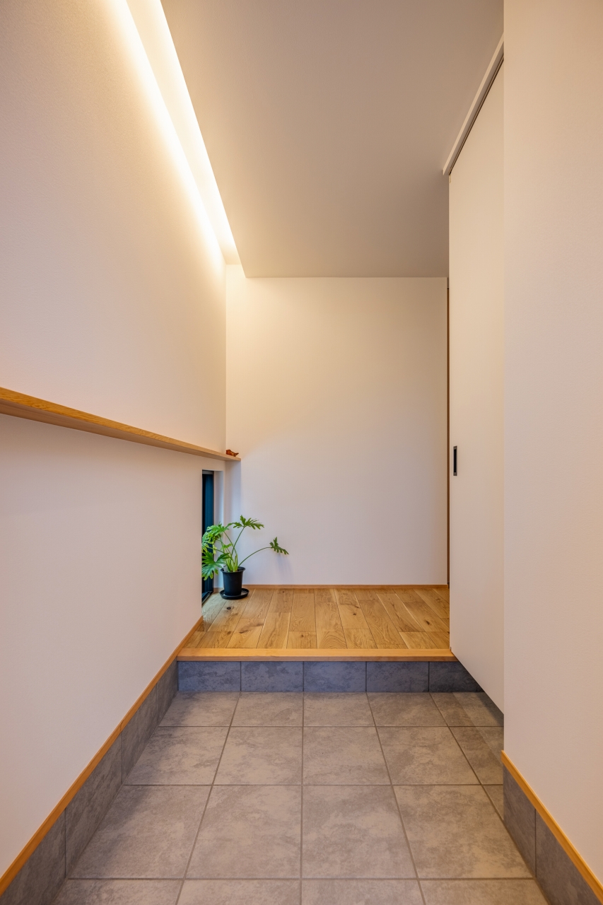 間接照明と一直線に伸びるカウンターが空間に奥行きを感じさせる。