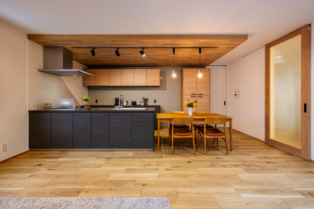 ブラックのスタイリッシュなオープンキッチン。木目の下がり天井で空間にメリハリが生まれる。