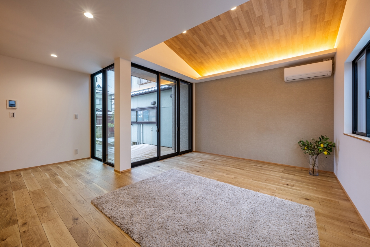 内と外をつなぐL字型の大きな窓。間接照明と板張りの勾配天井で更に空間にゆとりを生み出す。