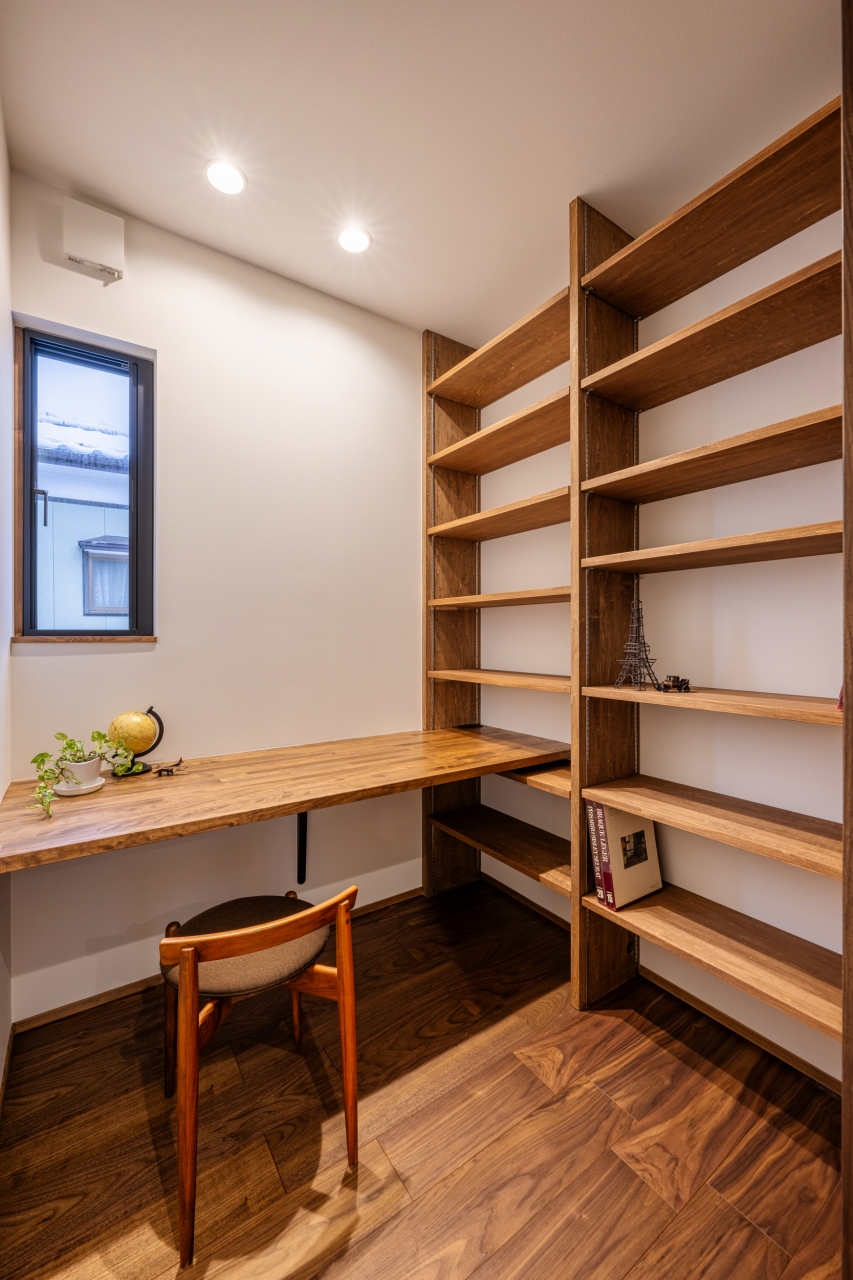 床のウォルナットに合わせてカウンターや棚も塗装し、落ち着いた空間に。