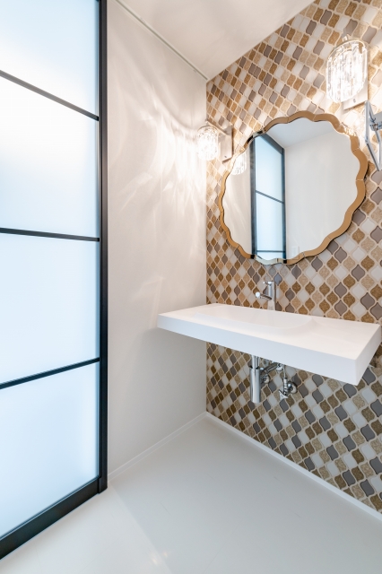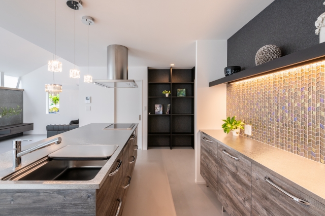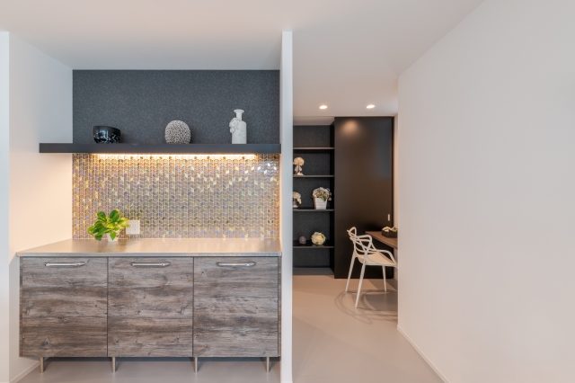 シンプルで直線的なフォルムの空間の中に 硬質なテクスチャーを多用し、 重厚さと華やかさを併せ持ったラグジュアリーな素材で遊ぶ。
