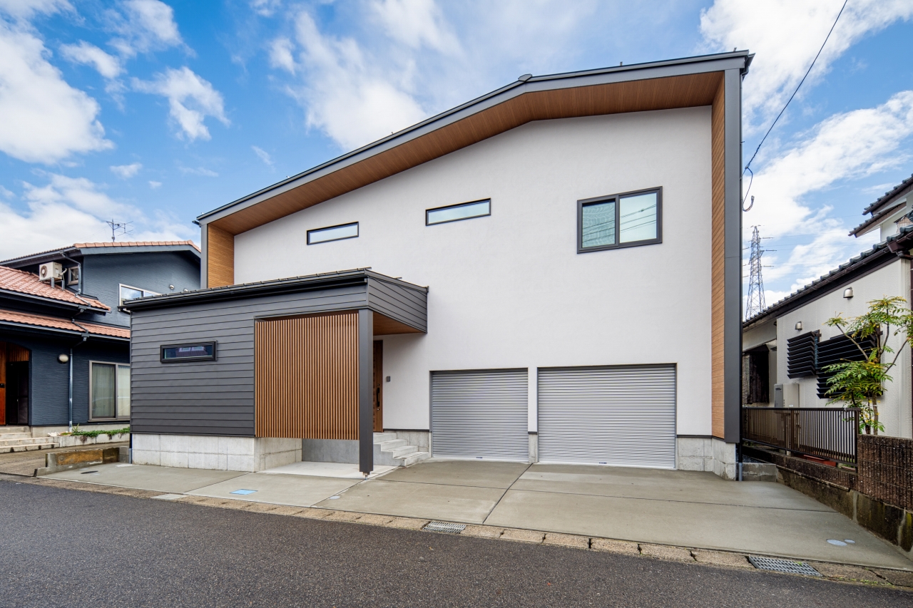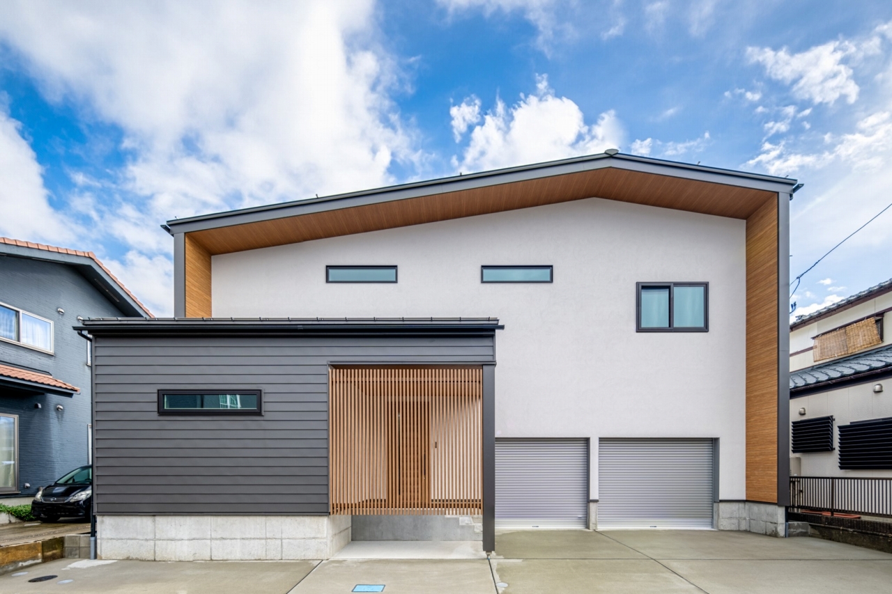 二つのボリュームをガルバリウムと塗り壁の異なる素材で仕上げた外観。木目調のフレームがアクセントに。