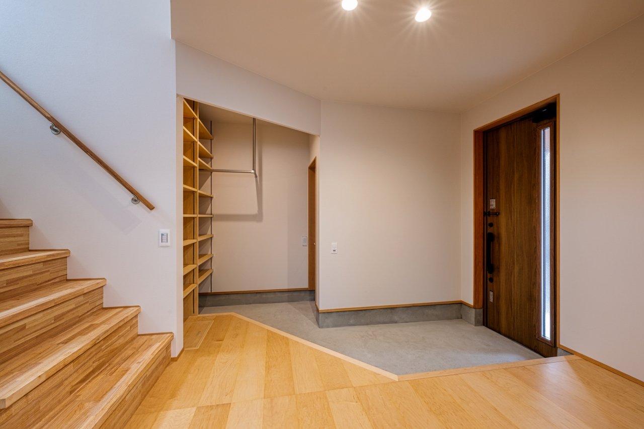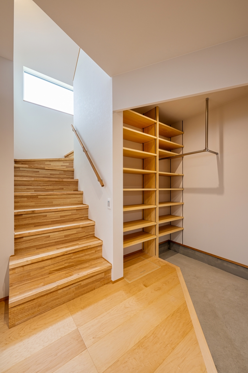 階段途中の窓から、暗くなりがちな玄関ホールへ光が落ちる。2FLDKの為、階段の幅も広めに設定。